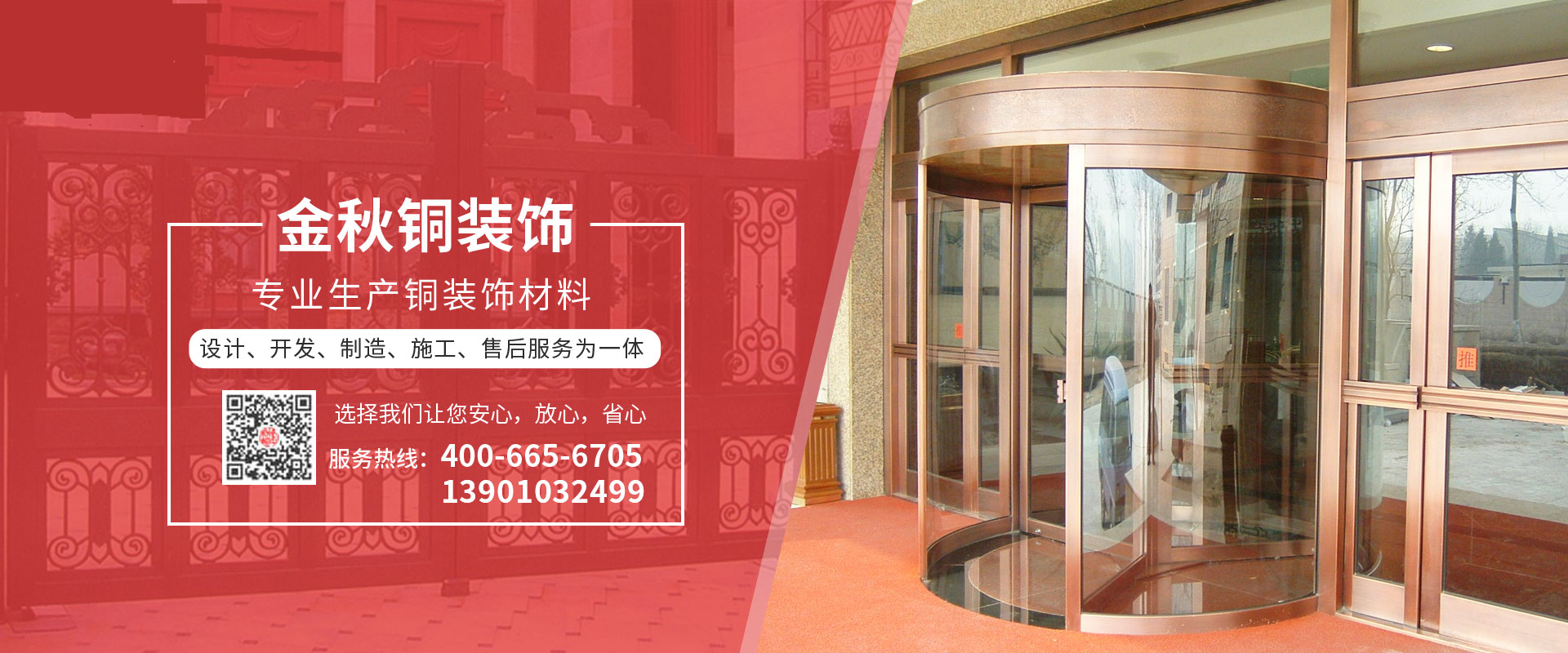 北京金秋銅裝飾材料有限公司是專業生產銅裝飾材料及設計、開發、制造、施工、售后服務為一體的大型綜合企業??沙薪咏ㄖ~裝飾工程及五星級酒店、別墅、博物館、樓樘管所等高檔銅裝飾項目;生產各種規格的旋轉門、平滑門、別墅門、電控門、工藝門、旋轉護欄、屋頂銅飾防水瓦、浮雕壁畫......